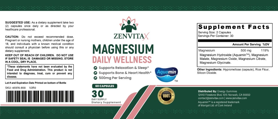 Experience the benefits of Magnesium Daily Wellness, a high-quality dietary supplement designed to support relaxation, sleep, and overall well-being. Each serving provides 500mg of magnesium, an essential mineral that plays a key role in bone health, heart function, and muscle relaxation. This formula includes Aquamin™, a premium marine-derived source of magnesium, ensuring optimal absorption and effectiveness. Whether you’re looking to maintain daily balance or promote relaxation, this supplement is an excellent addition to your wellness routine.