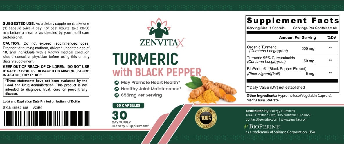 Enhance your daily wellness with Turmeric with Black Pepper, a premium dietary supplement formulated to support joint health and overall well-being. Each serving delivers 655mg of high-quality turmeric, including 95% curcuminoids, combined with BioPerine® black pepper extract to enhance absorption. Turmeric is widely recognized for its role in maintaining mobility and daily comfort, making this supplement a great addition to an active lifestyle.